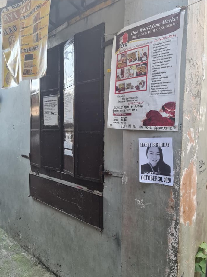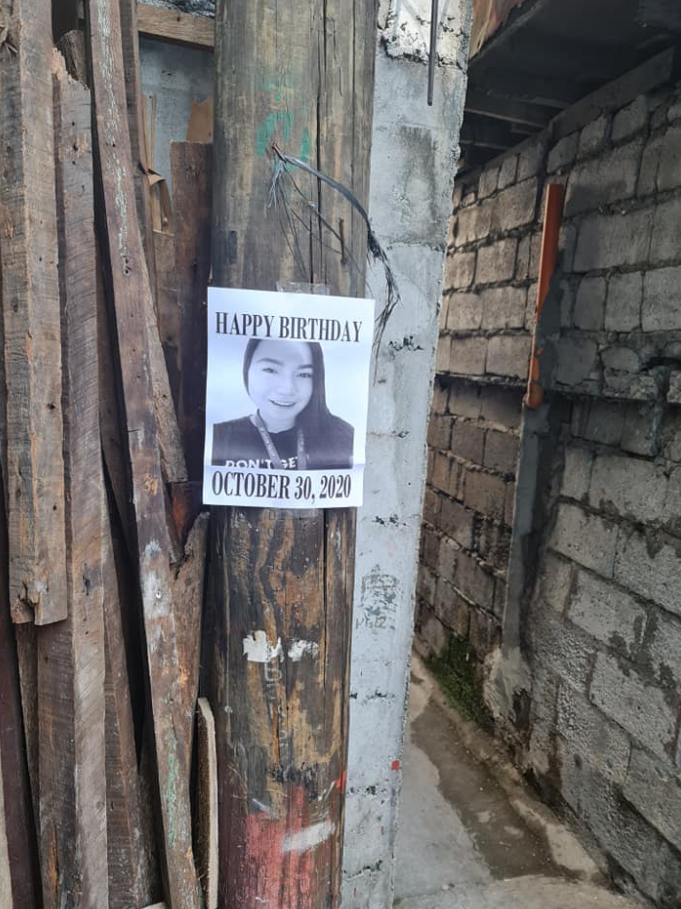 Nilakipan niya ng ilang mga larawan ang post niyang ito kung saan makikita ang larawan ng isang ababae na tila ba katulad ng mga nakapaskil na larawan ng mga “Wanted” o “Missing person”. Mayroong nakalagay na “Happy Birthday” at petsang October 30, 2020 ang mga larawan na nakadikit sa ilang mga poste, kariton, tindahan, “barangay patrol”, “computer shop”, pader, sasakyan, kainan at sa iba pang mga lugar.
