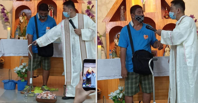 Isang lalaking may kapansanan ang namamalimos upang itulong sa simbahan para maibigay sa mga taong higit na nangangaila…