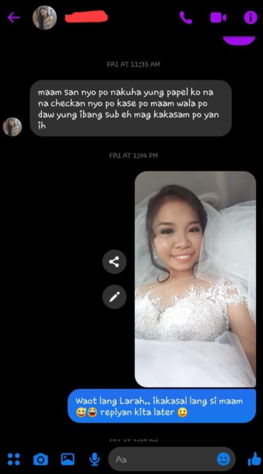 Kahit kasi sa araw ng kaniya mismong kasal ay hindi pa rin matatakasan ang pagiging isang guro niya. Ayon kasi sa kumakalat na screenshot ng naging pag-uusap nila ng kaniyang estudyanteng si Larah, magalang na tinatanong ng estudyante kung saan nakuha ng guro ang papel na nacheck-an ng kaniyang guro dahil sa nawawala diumano ang ibang mga subject o asignaturang kasama nito.