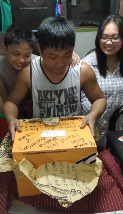 Marahil labis na kagalakan ang nararamdaman ngayon ng mister na ito dahil sa napaiyak pa nga siya nang matanggap ang isang regalo mula sa kaniyang misis. Ang pinapangarap niyang Evo helmet ay iniregalo sa kaniya ng kaniyang pinakamamahal na misis.
