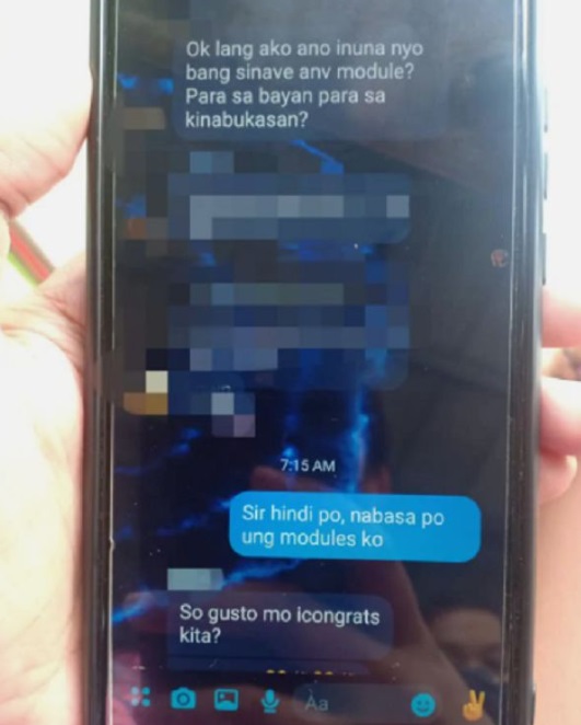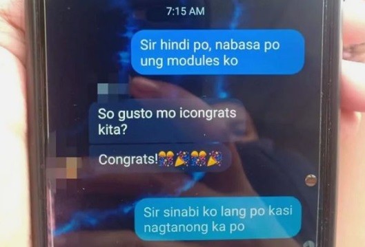 Nalulungkot man ay naging tapat ang estudyante at sinabing nabasa at nasira nga ng baha ang kaniyang mga modyul. Sagot naman ng kaniyang guro ay “So, gusto mo icongrats kita? Congrats!”